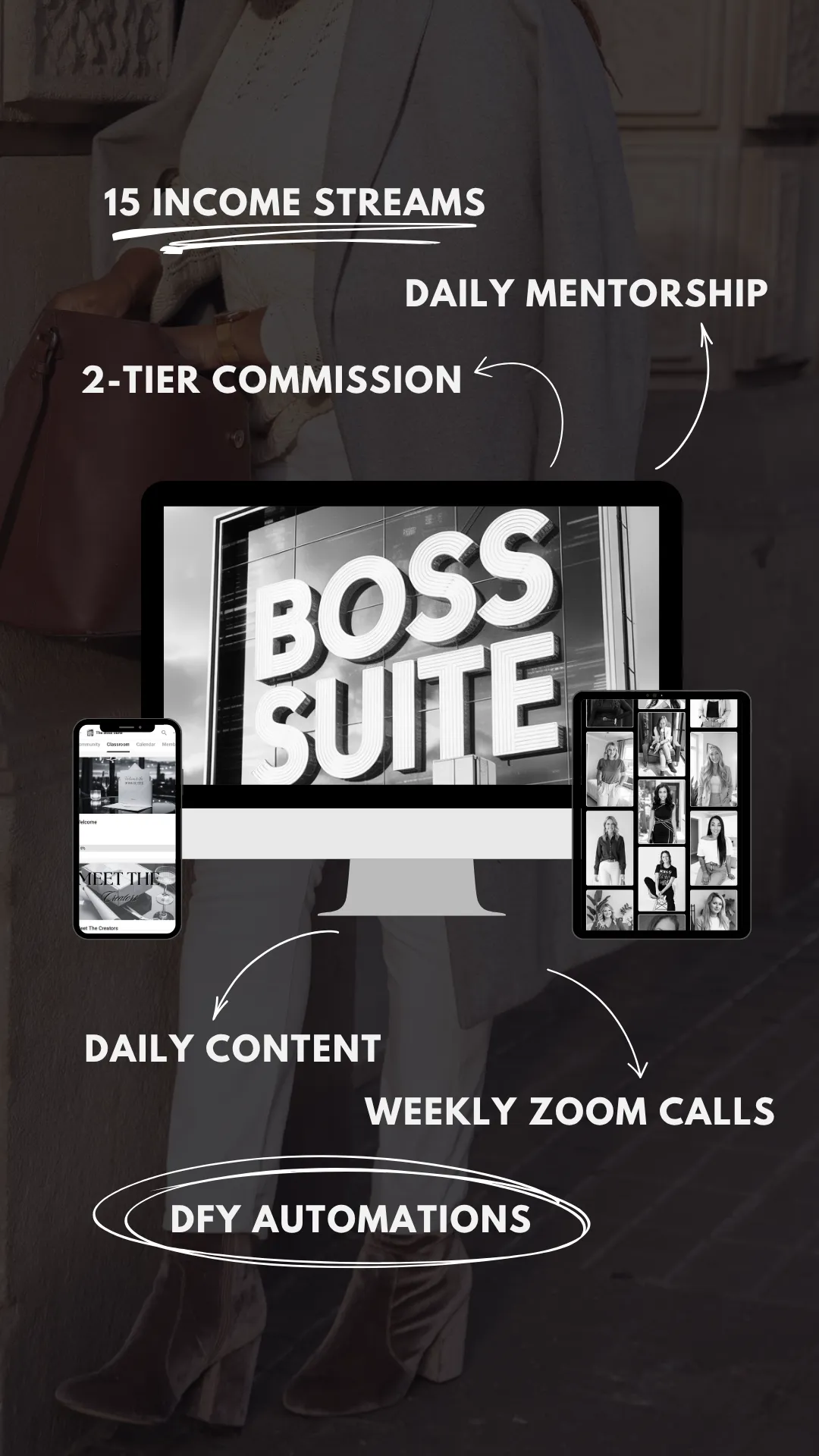 Daily mentorship • 60+ step-by-step modules • 3–4 weekly calls • 15 income streams • done-for-you setup